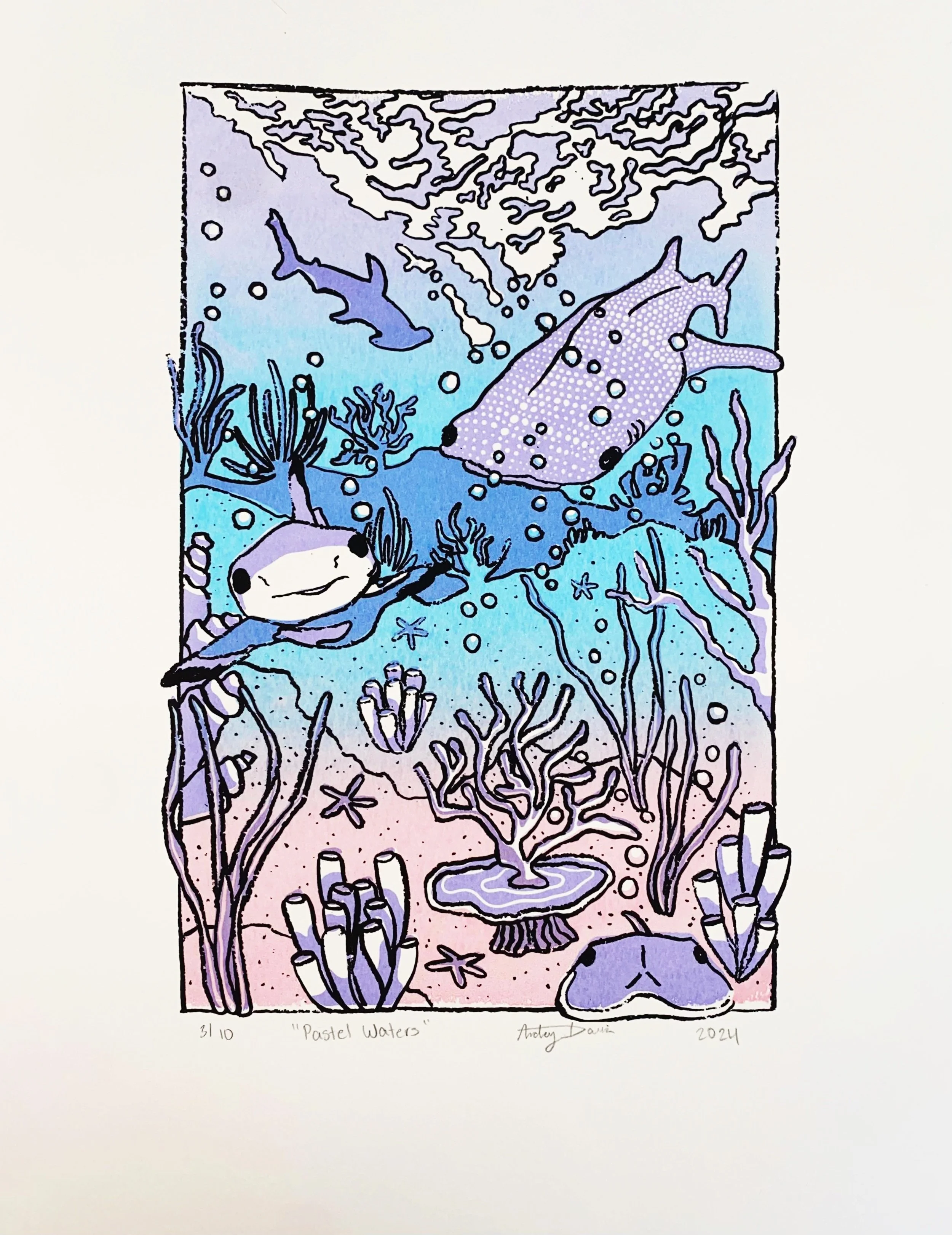 In “Pastel Waters,” a Blacktip reef shark, Whale shark, and Horseshoe crab make their way off the paper with a playful curiosity, approaching the viewer head on.